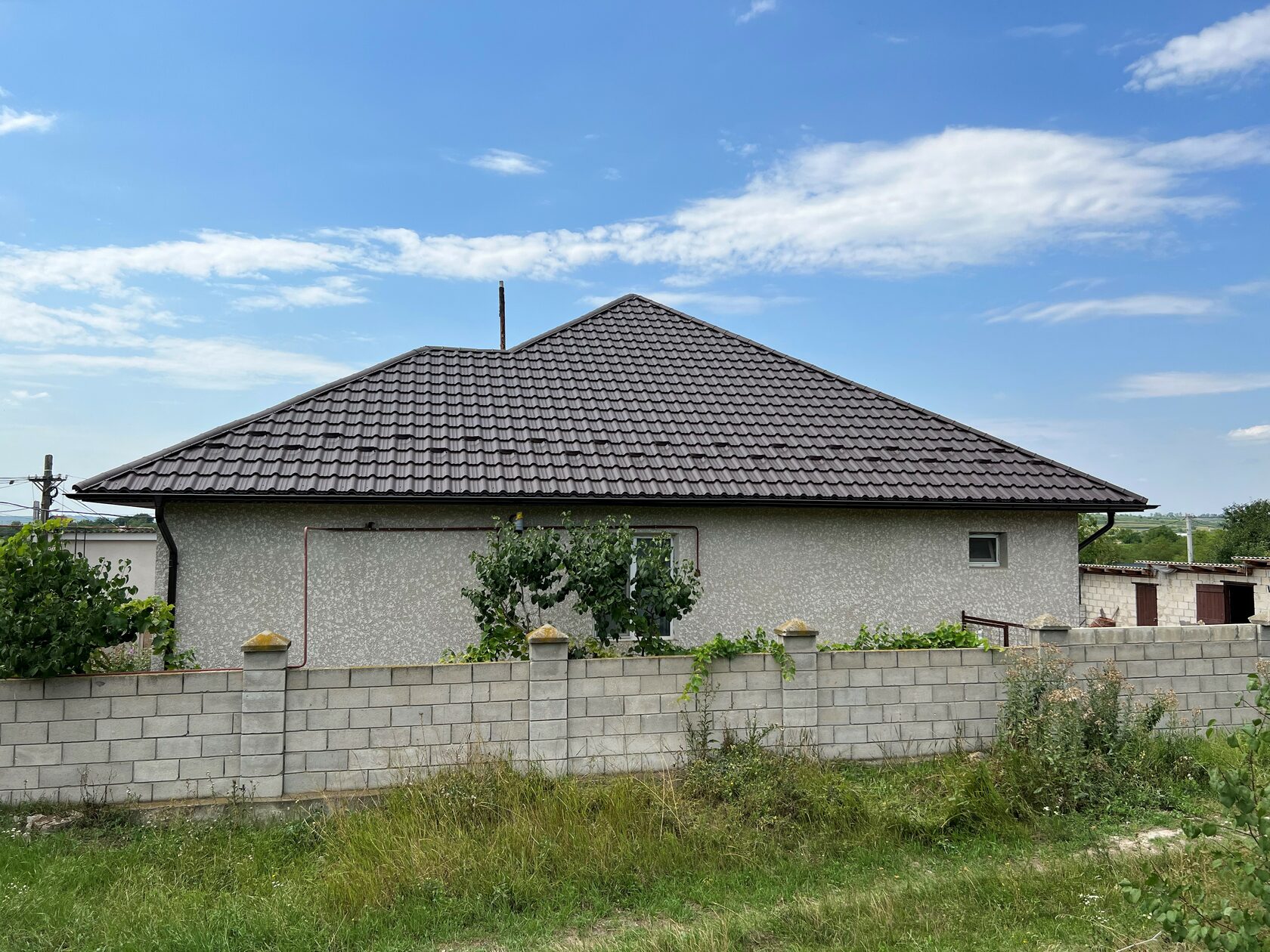 La această casă din comuna Băcioi, mun. Chișinău, am renovat acoperișul: am dat jos foile de ardezie și vechea carcasă din lemn, am asamblat carcasa nouă din lemn și am montat țigla metalică Alpina din tablă Coreea Matt, culoarea RAL 8019.
