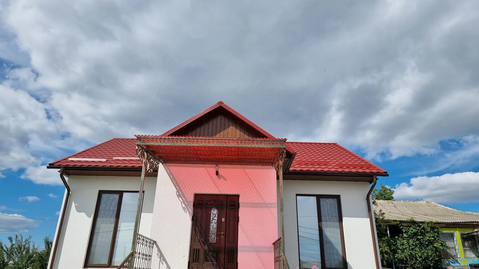 La această casă din satul Bașcalia, raionul Basarabeasca, am livrat pentru acoperiș țigla metalică Roofart Arctica, din tablă suedeză SSAB GreanCoat Mica, grosimea 0,50 mm, zinc 275 g/m2, culoarea RAL 3009. De asemenea, am livrat tabla cutată (profnastil) HP-7, imitație lemn închis, precum și sistemul pluvial din jgheaburi și burlane.