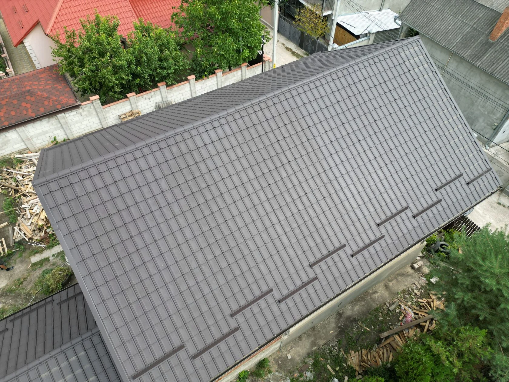 La acoperișul acestei case din cartierul Schinoasa, sectorul Telecentru, Chișinău, am livrat pentru montare țigla metalică Roofart Nordica, profilată din tablă coreeană Hi-Matt, grosimea 0,45 mm, culoarea RAL 8019, cu garanție 20 de ani la coroziune și 10 ani la culoare. De asemenea, acoperișul a fost dotat cu sistem pluvial din jgheaburi și burlane, profilat din tablă suedeză SSAB calitatea Premium.