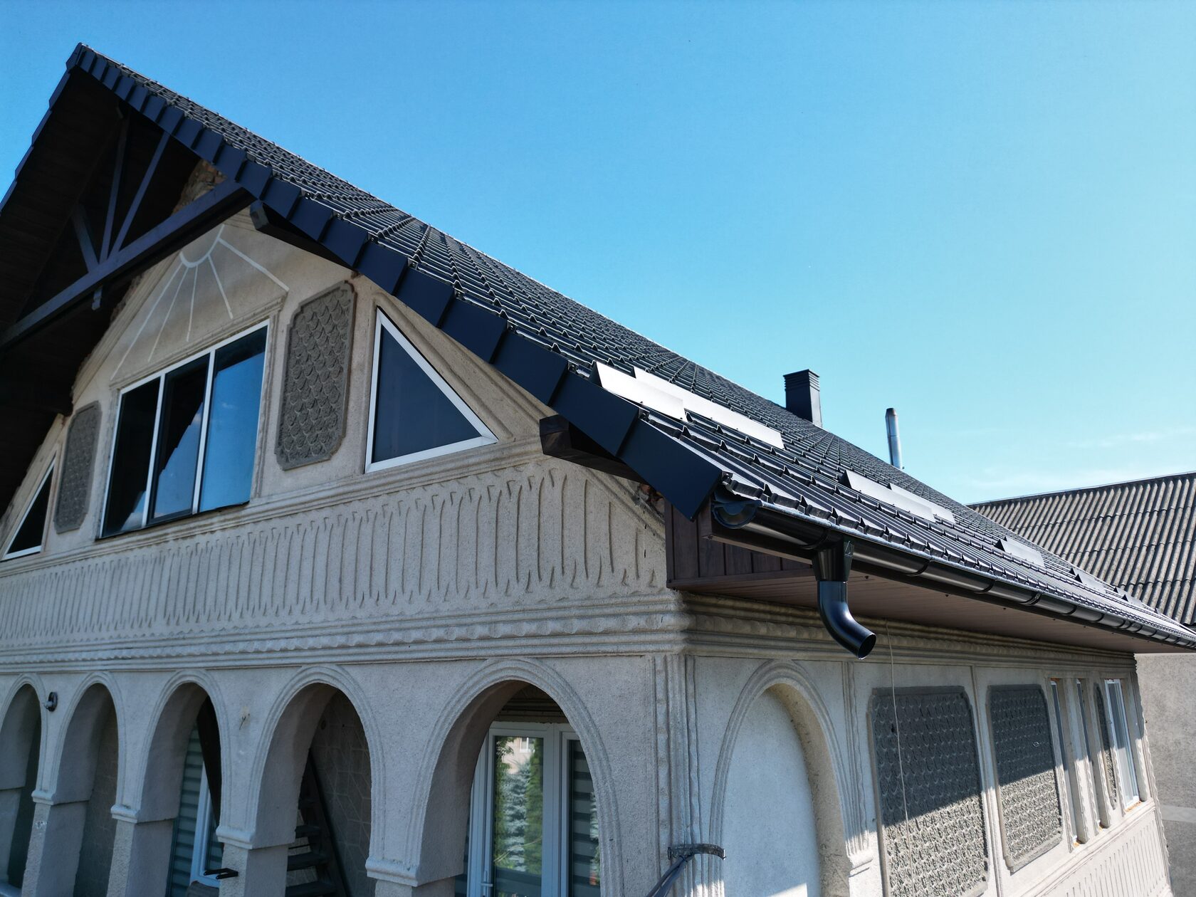 Am schimbat acoperișul acestei case din orașul Bălți, cu țigla metalică Roofart Nordica, profilată din tablă suedeză premium SSAB, culoarea RAL 9005, grosimea metalului 0,50 mm, grosimea totală – 0,54 mm, zinc – 285 g/m2, cu garanție 50 de ani la coroziune și 25 ani la culoare. De asemenea, am dotat acoperișul casei cu sistem pluvial din jgheaburi și burlane, profilat din tablă suedeză SSAB, cu garanție 30 de ani la coroziune și 15 ani la culoare.