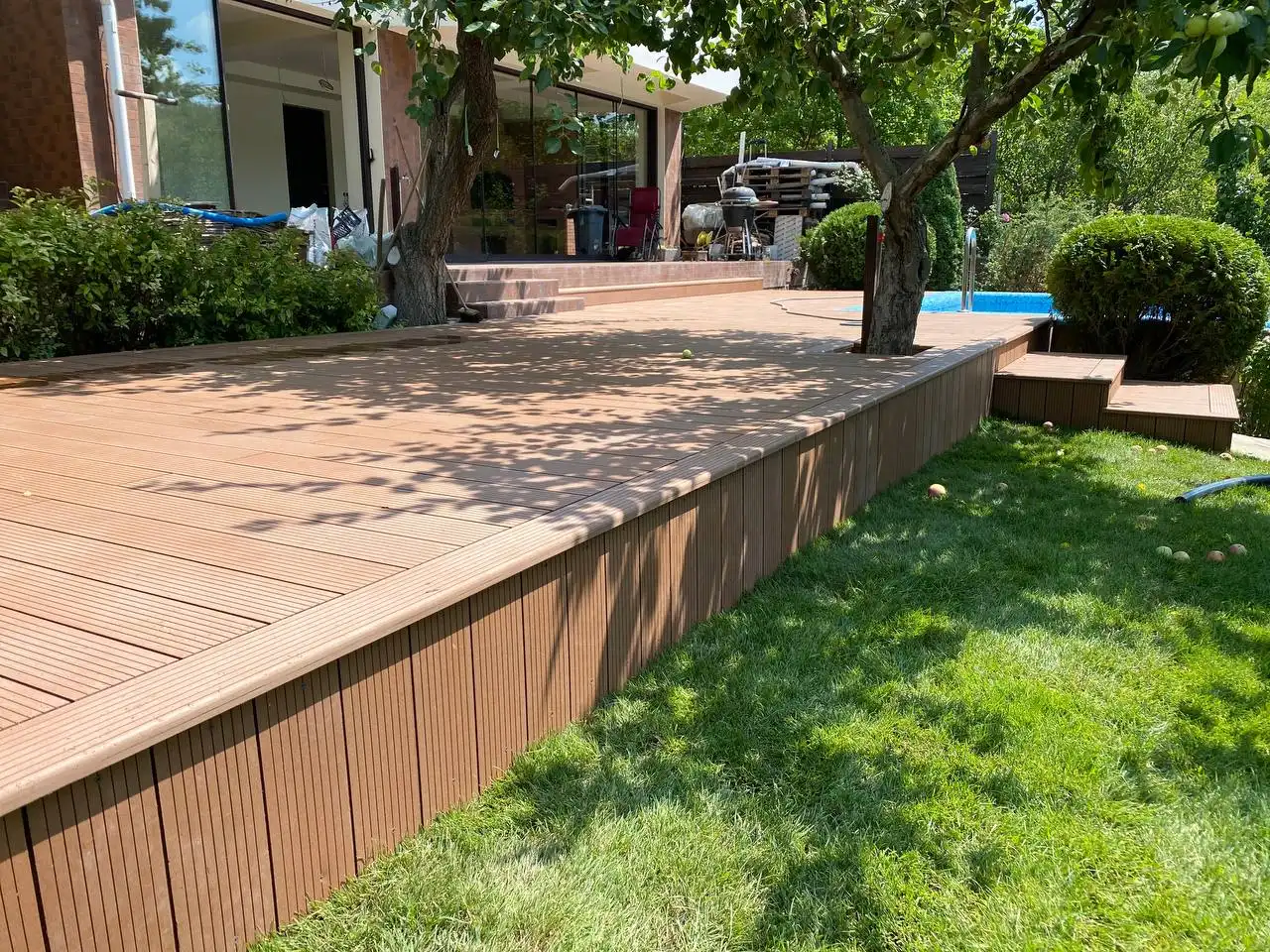Мы завершили элегантный проект по укладке террасной доски из ДПК (древесно-композитного композита) цвета «мербау» на террасе этого дома в деревне Гоянул Ноу, коммуна Стэучени, муниципалитет Кишинев.